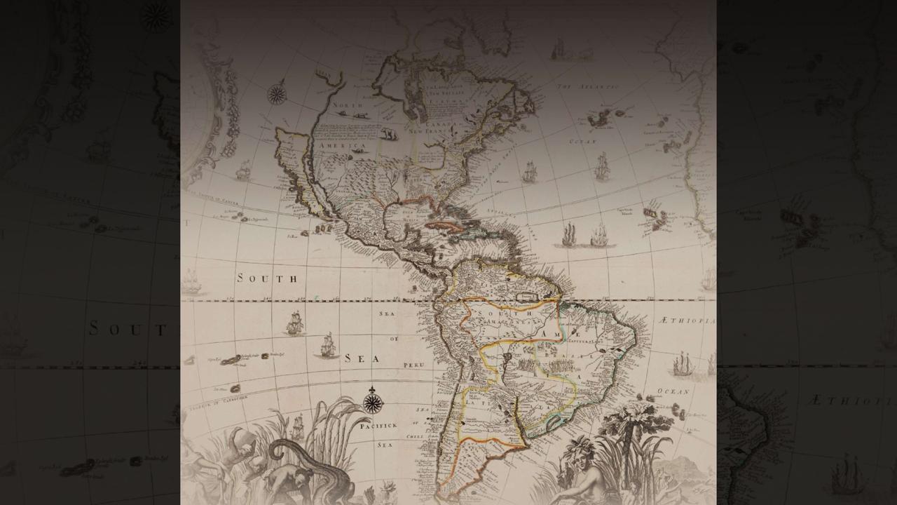 Se trata de una manifestación cartográfica del siglo XVIII, probablemente del escocés Henry Overton, donde California no aparece integrada al resto de estados de la Unión, y con dos representaciones a izquierda y derecha del continente, en la parte inferior, donde se representa en el lado izquierdo a tres hombres llevando el peso de su faena, en lo que claramente es una plantación, y por lo tanto esclavos con una aparente diosa de la fortuna cortada en más de la mitad, mientras que en el otro, con aire primitivo y pagano, lo que parece inferirse como una suerte de representación de la luctuosidad selvática, amazónica o cualquier otra, pero sobrecargado de sensualidad primitivoide.