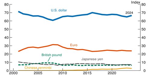 Según este índice, que se muestra en el gráfico siguiente, el dólar se ha mantenido relativamente estable durante todo el período comprendido entre 2000 y 2024, oscilando entre 60 y 70. El euro también ha fluctuado poco, entre 20 y 30, al igual que el yen japonés y la libra esterlina, entre 5 y 10. Por otro lado, el renminbi chino (RMB) ocupa solo el quinto lugar en la jerarquía internacional de divisas, con un crecimiento de 0 a 3 en los últimos 15 años. Además, el valor del índice de uso del dólar es superior a la suma de las demás divisas en cualquier año del período analizado.