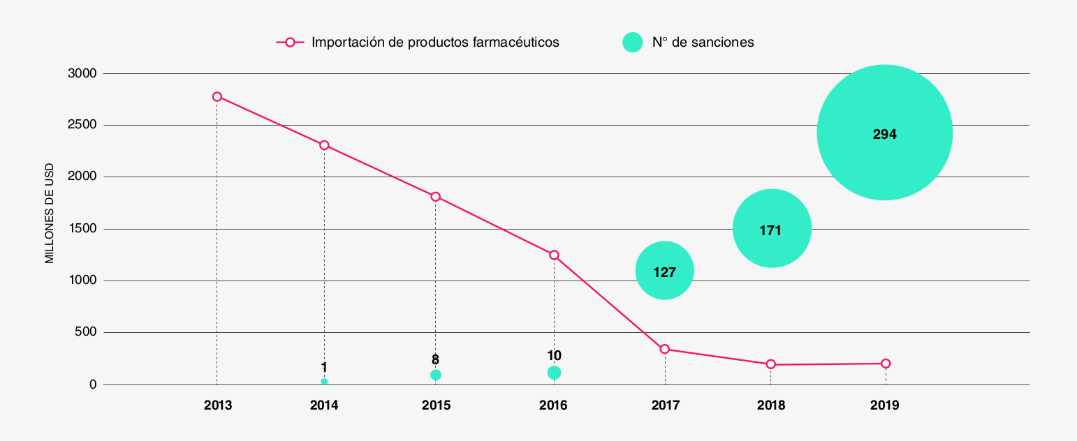 La importación de productos farmacéuticos se desplomó de 2.783 millones de dólares en 2013 a apenas 184 millones en 2020. Entre 2015 y 2018, la movilización de medicamentos del sector público a los servicios de salud cayó un 73%.