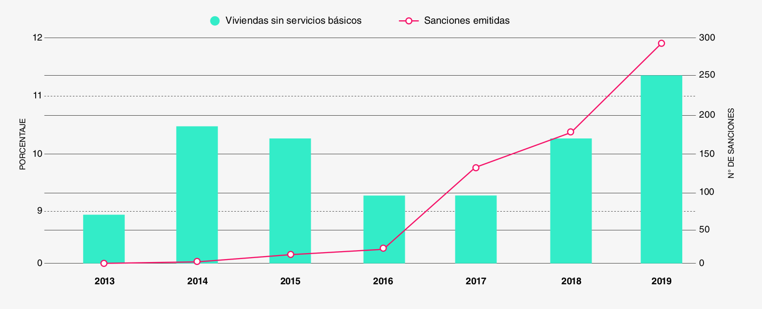 La velocidad de construcción de viviendas de la Gran Misión Vivienda Venezuela (GMVV) experimentó una caída drástica a partir de 2016, correlacionada directamente con la disminución de los ingresos petroleros. El porcentaje de hogares sin acceso a servicios básicos —agua, electricidad, gas— pasó del 8,9% en 2013 al 11,4% en 2019, un incremento que coincide con la escalada sancionatoria que alcanzó las 294 medidas ese año.